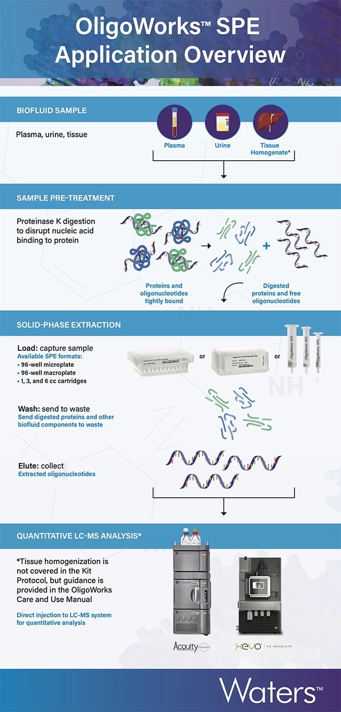 Oligonucleotide therapies are evolving fast, creating analytical challenges resulting from modifications, conjugates, and novel formulations. Waters simplifies your workflow with an integrated solution: the OligoWorks SPE Kit, the Andrew+ Robot for automated sample prep, and OneLab Software with click and execute protocols. Easily handle lipid-conjugated oligos across plasma, urine, and tissue homogenates. And with Waters’ GTx columns, UPLC, MS, and ProMass you can have an end-to-end solution and end-to-end confidence. Enjoy drag-and-drop protocol creation, guided compliance, and real-time support, all designed to deliver faster, more consistent results.
