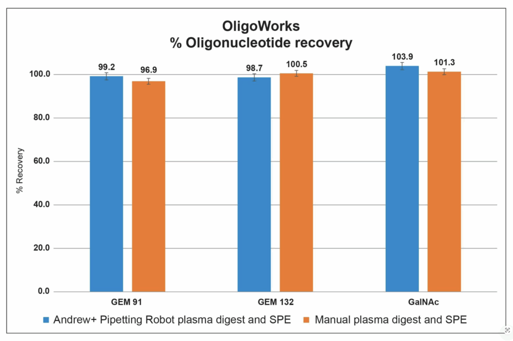 Accelerate oligonucleotide bioanalysis with Waters. Combine the OligoWorks Kit, Andrew+ Robot, and OneLab Software to automate complex workflows, without the need for any coding. Confidently handle diverse oligo types, including lipid-conjugated species, across plasma, urine, and tissue homogenates with precision and ease.