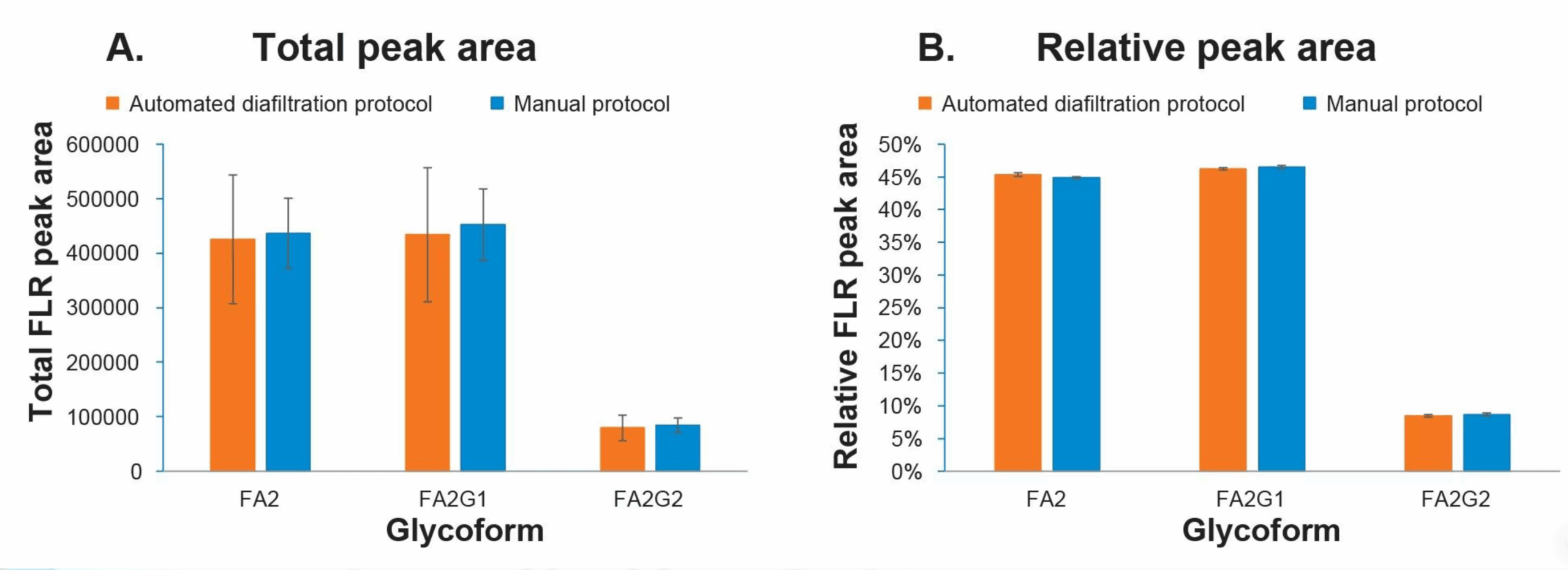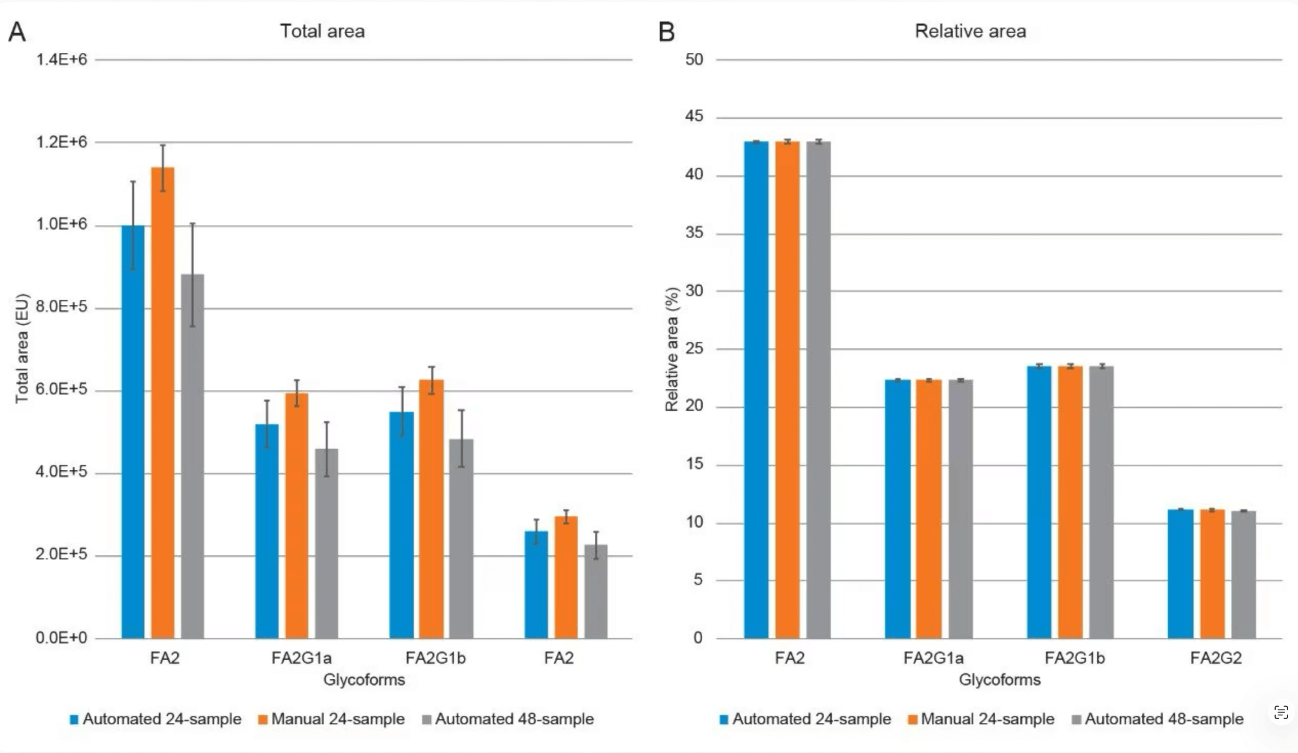 Manual and automated 24-sample preparations alongside automated 48-sample preparations of Intact mAb Mass Check Standard (P/N 186006552) murine IgG1 protein. Data sets are cumulative of 2 preparations on different days for a total of N = 48 for the 24-sample preparations and N = 96 for the 48-sample preparations. A) Total area comparison of the 4 major glycoforms monitored from the chromatographic profile. B) Relative area comparison of the same 4 glycoforms.