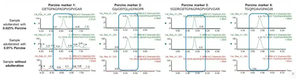 Comparison of MRM chromatograms for the four porcine markers in halal-labeled candy with and without the addition of the porcine gelatin standard.