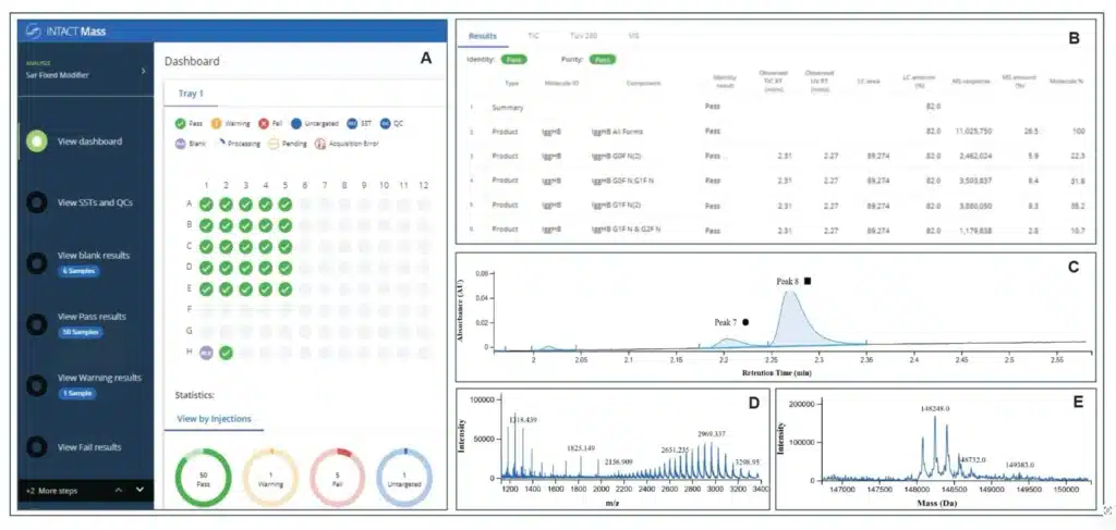 Display of Intact Mass App in the waters_connect™ platform. (A) Dashboard view showing injections and status of mAb detection, green color indicates the sample has passed detection criteria set in the method. (B) Summary table of modifications observed for the mAb produced including r.t., MS response, %modifications and other info. (C) Observed TUV chromatogram, which is used for peak detection. The first peak shown is light chain (LC) of the mAb, second peak is intact mAb. (D) Observed spectrum of the intact mAb peak, showing charge state distribution. (E) Deconvoluted spectrum of intact mAb, exhibiting the expected four major glycan modifications.