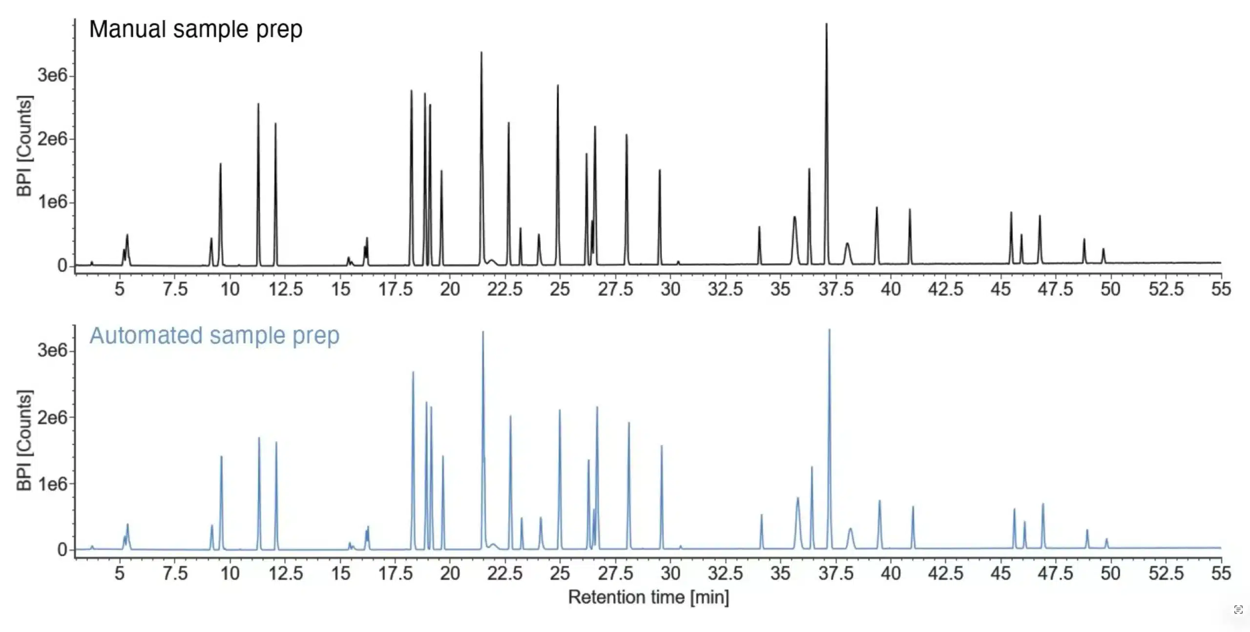 BPI chromatograms of NISTmAb digests prepared using the manual and automated PeptideWorks workflows, showing equivalent results.
