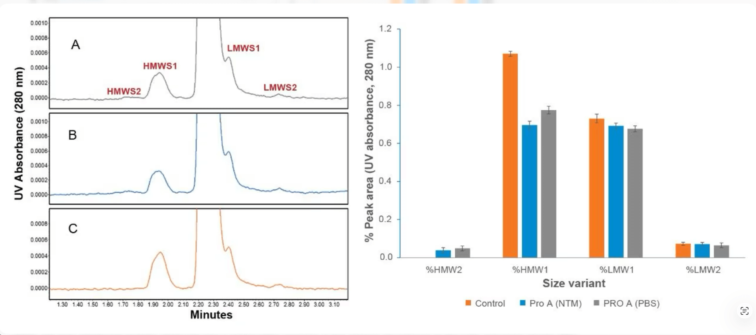Evaluation of the SEC-UV quantitative results for protein A purified mAb spiked into A; PBS (n=8, gray) and B; non-transfected CHO cell conditioned media (NTM, n=8, blue) compared to C; a spike control (n=3, orange). These data were collected on an ACQUITY™ Premier BSM UPLC.